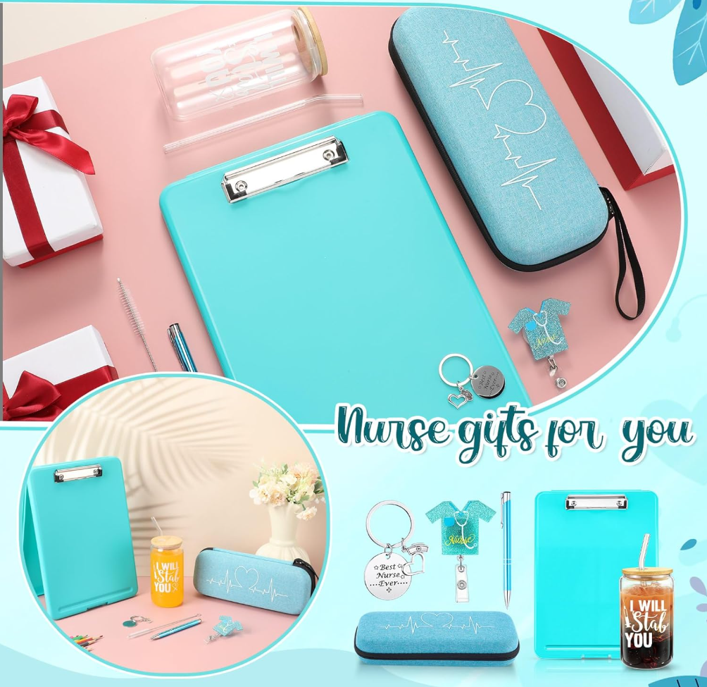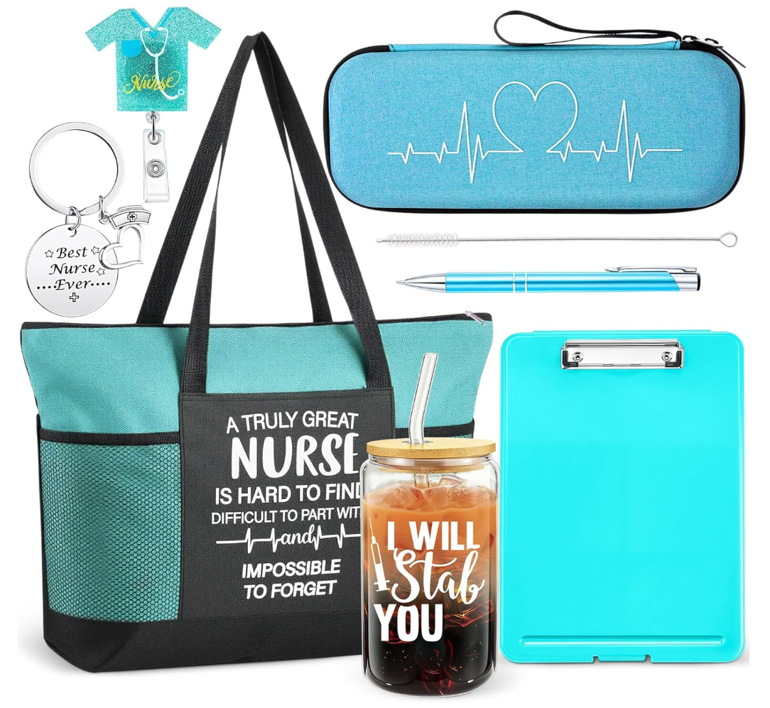 This nurse gifts set includes a 16 oz glass coffee mug with straw and brush, a nurse tote bag, a stethoscope case, a nurse clipboard, a badge scroll, a nurse pen, and a nurse keychain; Every nurse will love this gift set; This gift set is practical and easy to carry to work