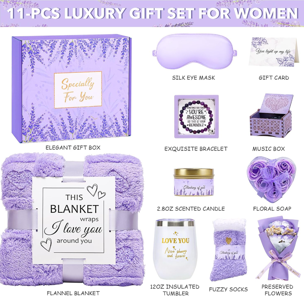 • 【11PCS CARE PACKAGE GIFTS】 The Joyliss Women’s Exclusive Gift Set contains a carefully curated selection of luxurious items, including flannel blanket*1, 12oz insulated mug*1, romantic music box*1, bracelet*1, 2.8oz scented candle*1, bath flower*1, preserved bouquet*1, gift card*1, plush socks*1, silk eye mask*1, and a gift box. Perfect for Mother’s Day and Christmas, this gift helps women relax and unwind. It’s also an excellent Valentine’s Day gift for your girlfriend or wife!